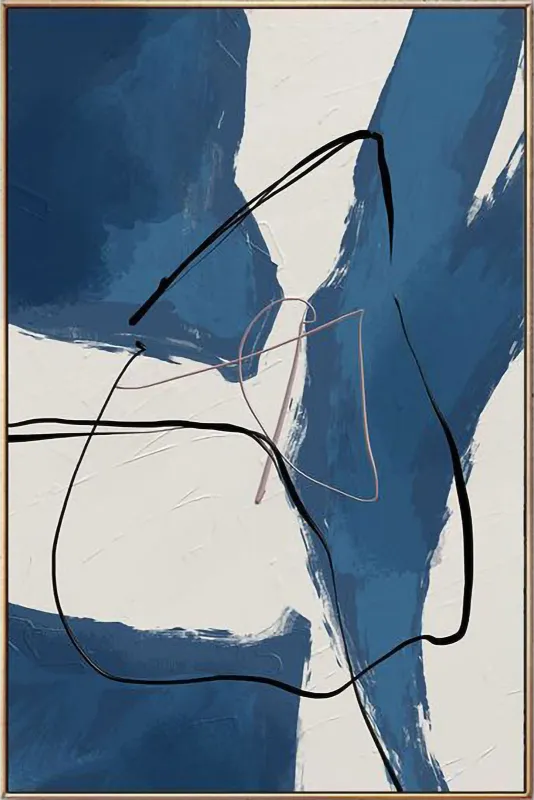 This is a captivating abstract painting that exudes a minimalist and modern feel. The painting features a white background adorned with blue and black brushstrokes. The thick blue brushstrokes cover most of the painting, while the thin black brushstrokes form a loose, continuous line that loops around the painting, adding an element of dynamism. The painting is framed in a thin black frame, enhancing its modern aesthetic. The contrast between the thick blue and thin black brushstrokes against the white background creates a visually striking piece that is sure to draw attention. This handmade painting is not just an art piece – it’s an expression of style and taste. Its abstract nature invites viewers to interpret and find their own meaning in it.
