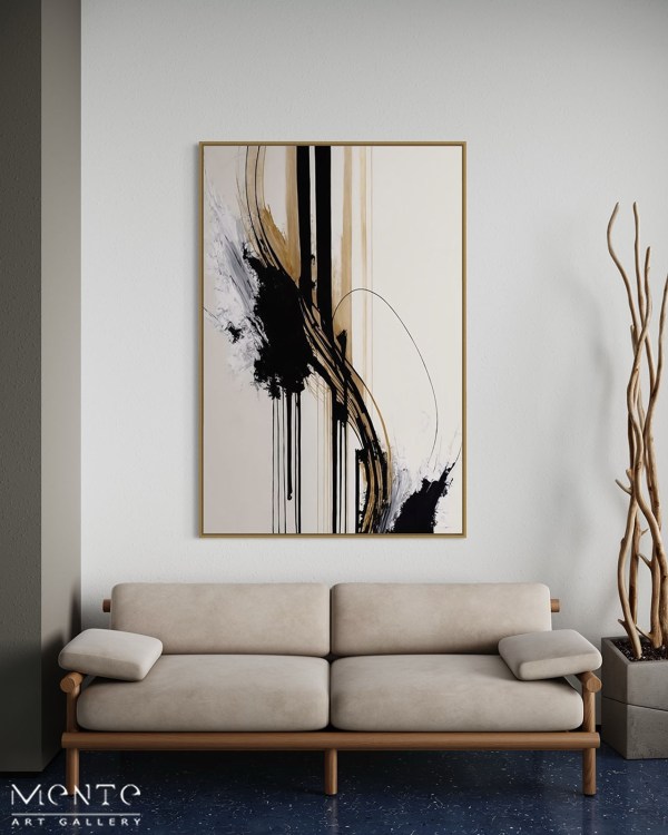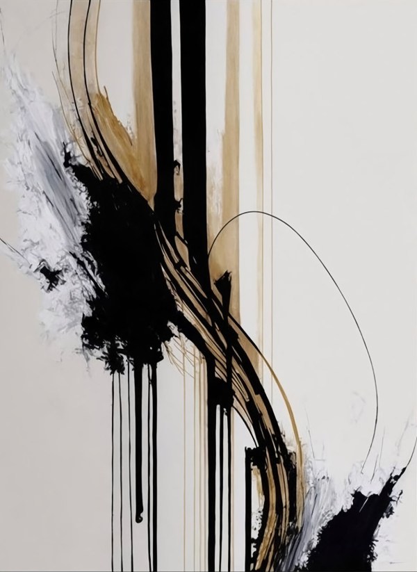The painting features bold black lines and strokes intertwined with softer golden tones against a white background. There are dramatic drips of black paint that cascade downwards, adding an element of spontaneity. A section on the left side has textured brushwork in both black and white paints, contributing to the abstract nature of the artwork. Golden streaks are seamlessly integrated with the black elements, offering warmth and contrast. The composition is characterized by its fluidity and motion conveyed through varied brush strokes.