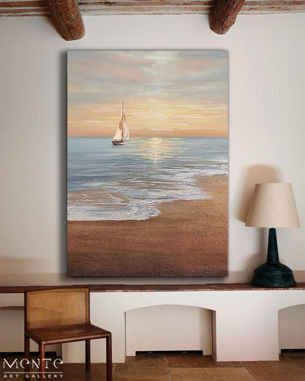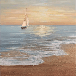 This artwork is a photo-realistic painting that beautifully captures a serene scene of a sailboat on the ocean at sunset. The sailboat, white with a single mast and a triangular sail, stands out against the calm ocean with its small waves. The sky, painted in hues of orange and pink with a few clouds, creates a warm and inviting atmosphere. The sandy beach and the light blue water add to the tranquility of the scene. One of the most striking features of this painting is the setting sun on the horizon, its reflection dancing off the water, adding a magical touch to the overall composition.
