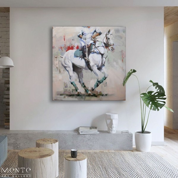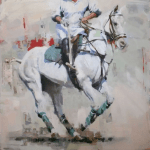 This artwork is an oil painting that beautifully captures a scene of a person on a white horse. The person, dressed in a white shirt and blue pants, holds a long stick, adding an element of intrigue to the scene. The horse, painted in white, stands out against the abstract background. The horse’s legs are adorned with green wraps, adding a touch of color to the piece.