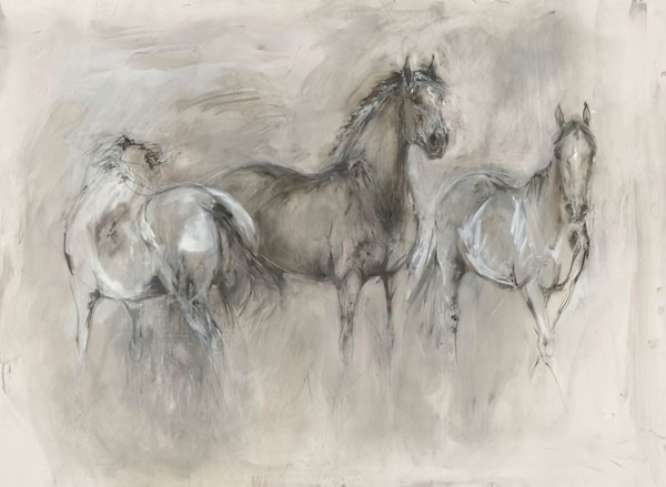 The horses are drawn with loose, fluid lines, giving them a sense of movement and life. The background is a wash of gray, creating a contrast and focus on the horses. The painting is done in black and white, giving it a classic and timeless feel.