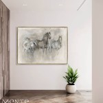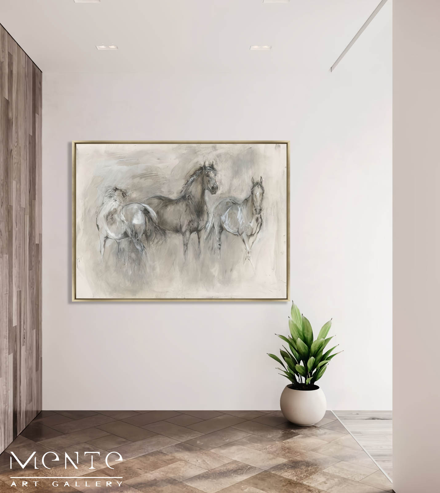 This is a beautiful and original handmade painting that portrays the beauty and grace of three horses. The painting shows three horses standing in a row, facing the viewer, each with a different pose and expression.