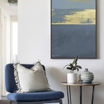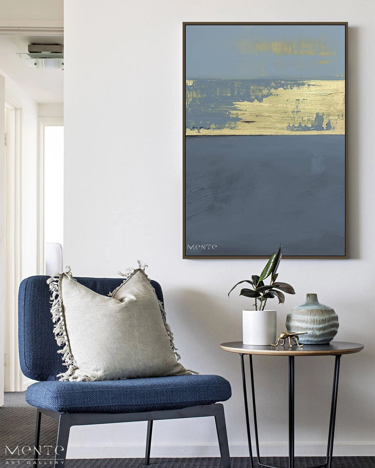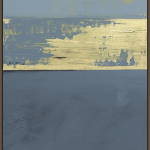 This is a modern and abstract handmade painting composed of three main colors: blue, gold, and gray. The painting is divided into three sections. The top section is blue with gold brushstrokes, creating a beautiful contrast. The middle section is gold with blue brushstrokes, adding a touch of elegance. The bottom section is gray with black brushstrokes, providing a solid base for the artwork. This painting would make a stunning addition to any collection or decor.