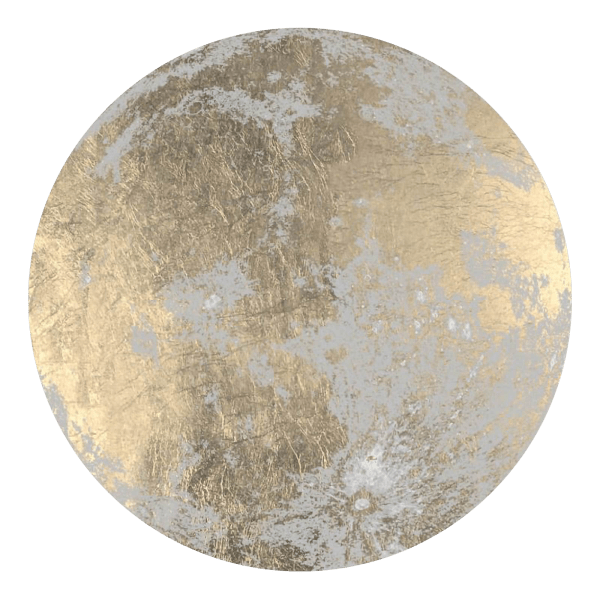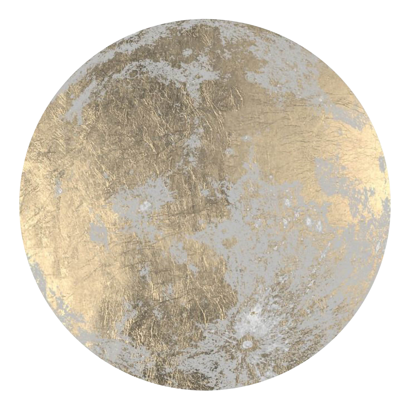 This is a handmade circular painting that exudes a sense of luxury and timelessness. The painting features a textured surface with patches of white and gray, giving it an aged or weathered appearance. The dominant color appears to be gold or a gold-like material, adding an opulent feel to the piece.