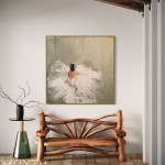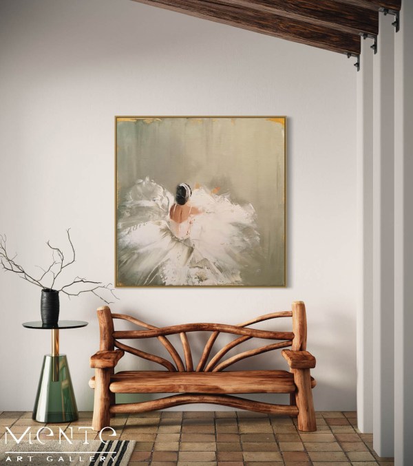 This is a lovely oil painting of a ballerina in a tutu that will enchant you with its beauty and grace. This painting is handmade by a skilled artist who uses oil paints and a brush to create a loose, impressionistic style with broad brushstrokes. The painting shows a ballerina from the back, with her arms extended and her tutu spread out around her. The background is a muted gray, with hints of gold and orange peeking through, creating a contrast and warmth. The painting is on a beige canvas, with the edges of the canvas visible, giving it a rustic and authentic look. This painting is a unique and original piece that will add a touch of elegance and charm to your home.