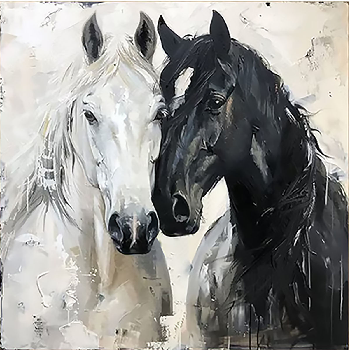 This handmade painting features two horses side by side against a neutral, textured background. The horse on the left is painted in shades of white and light gray, while the horse on the right is depicted in deep black tones. Both horses are portrayed with detailed brushwork that highlights their manes and facial features, creating a dynamic contrast between light and dark. The composition captures the essence of equine beauty and grace, making it an interesting piece for those who appreciate animal-themed art or seek to add a touch of elegance to their space.