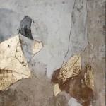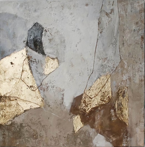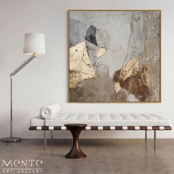 This is a gorgeous abstract painting that will add a touch of sophistication and elegance to your home. This painting is handmade by a skilled artist who uses acrylic paints and a gold foil to create a gray and gold color scheme. The painting is on a square canvas that has a grayish-white background with some texture. The foreground consists of two large gold-colored shapes that resemble leaves or petals. The gold shapes are outlined in black and have some texture. The painting has a rough, unfinished look to it, giving it a modern and artistic flair. This painting is a unique and original piece that will suit any room in your home.