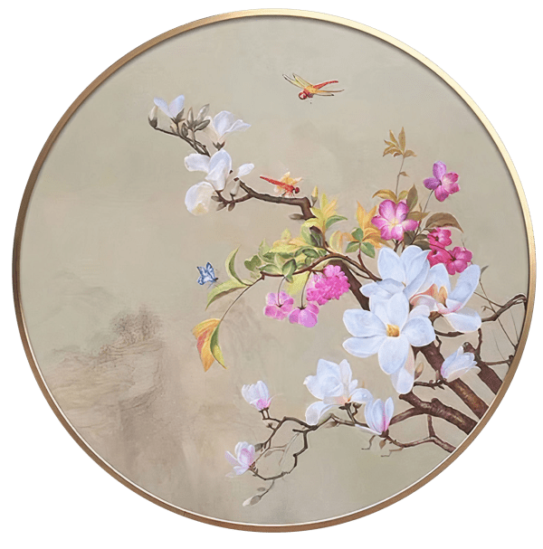 This artwork is a photo-realistic, circular painting that beautifully captures a branch of white and pink flowers in bloom, accompanied by a red dragonfly and two butterflies in blue and yellow. The painting is encased in a round gold frame, adding an elegant touch to the piece. The background is a light beige color with a subtle texture, providing a soft contrast that allows the vibrant colors of the flowers and insects to stand out. The branch, adorned with white and pink flowers and green leaves, adds a touch of nature’s beauty to the painting.