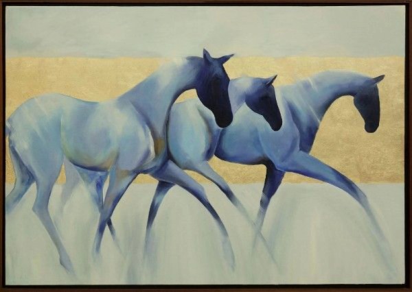 This is a captivating handmade painting featuring three blue horses on a beige background. The horses, painted in a abstract style with attention to detail, appear to be in motion, as if galloping. The solid beige background provides a stark contrast to the blue horses, making them stand out prominently. The painting is framed in a simple black frame, which complements the artwork beautifully. This painting would make a stunning addition to any collection or decor.