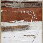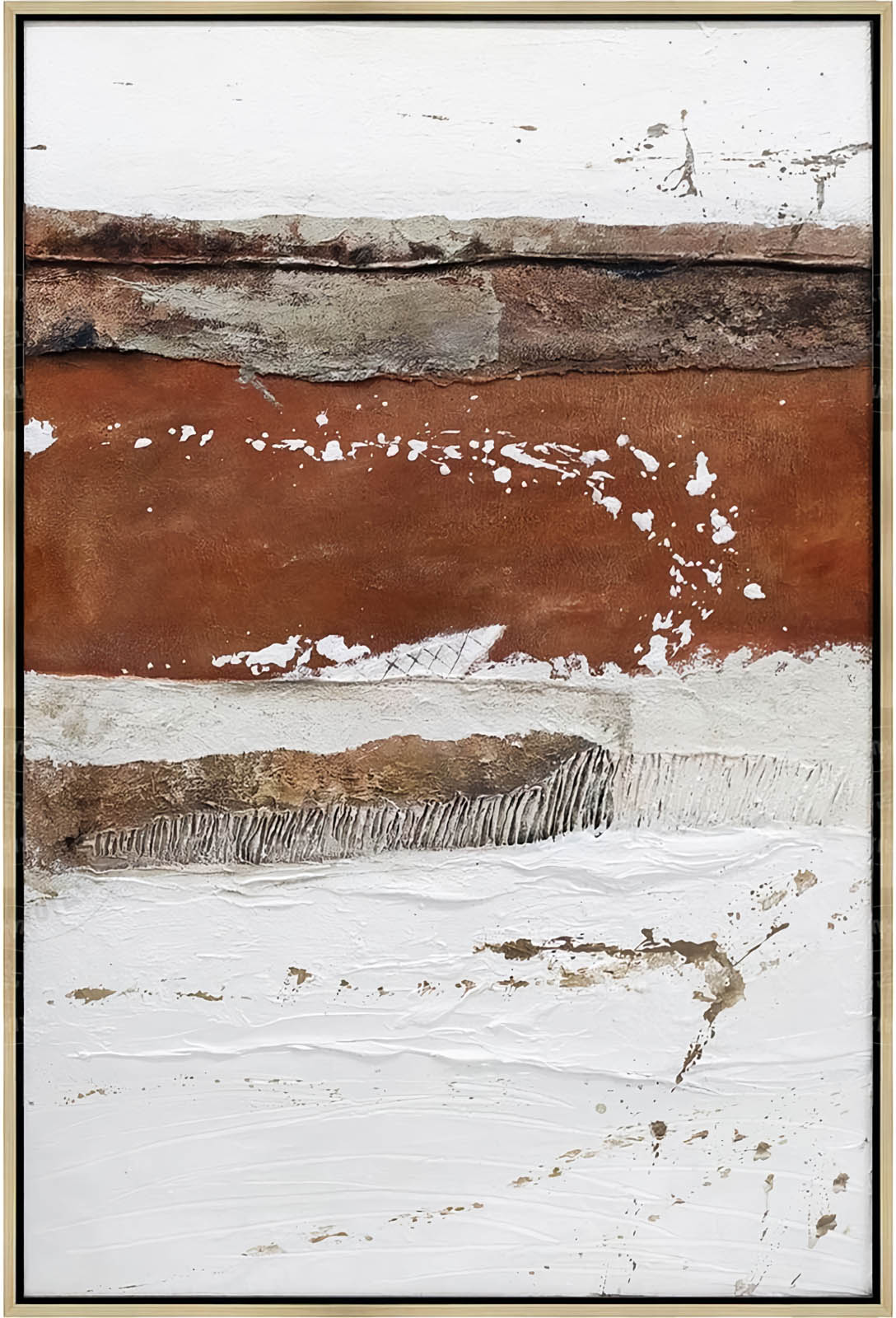 This is a beautiful abstract painting that will add a touch of color and texture to your home. This painting is handmade by a talented artist who uses acrylic paints and a palette knife to create horizontal layers of different colors and textures. The painting is in a rectangular frame with a white border that highlights the artwork. The painting is made up of three layers: the top layer is a light beige color with some cracks and lines, the middle layer is a rusty orange color with some white splatter, and the bottom layer is a light gray color with some darker gray lines and marks. The painting has a rough and textured appearance that creates a contrast and depth. This painting is a unique and original piece that will suit any style and taste.
