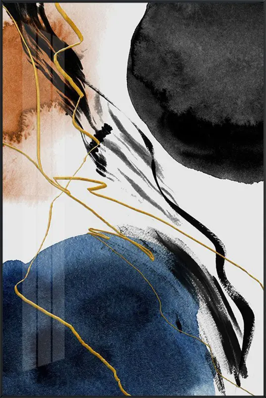 A navy blue shape on the bottom left corner, also outlined with a thin gold line, provides a striking contrast to the rest of the painting. The art piece has a rough and textured feel to it, giving it depth and dimension.