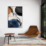 The main focus of the art piece is a bold black and white brush stroke that starts from the top left corner and extends to the bottom right corner. This dynamic element is outlined with a thin gold line, adding a touch of elegance to the piece.