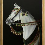 This captivating handmade painting features a white horse against a stark black background, creating a striking monochromatic contrast.