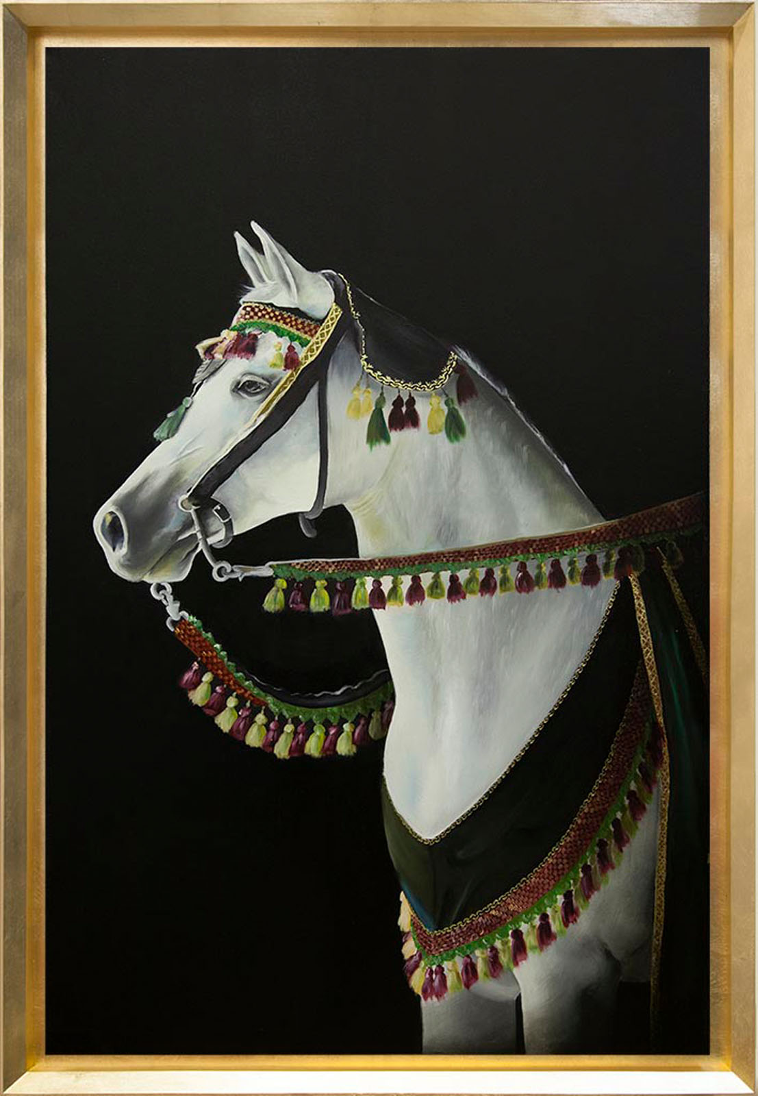 The horse is adorned with a green and red harness and tassels, adding vibrant touches of color. Facing the left side of the frame, the horse conveys a subtle sense of movement and life.