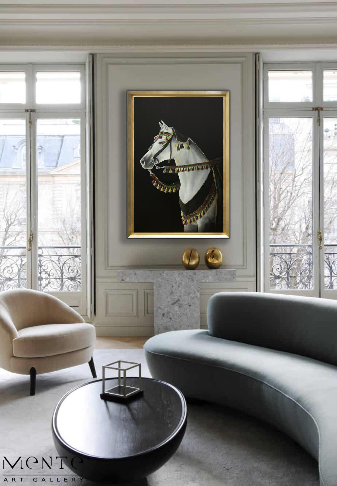 This captivating handmade painting features a white horse against a stark black background, creating a striking monochromatic contrast.