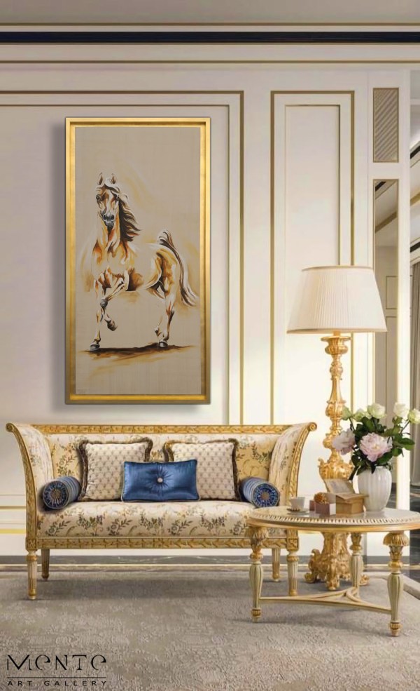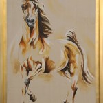 This dynamic handmade painting beautifully captures a horse in motion. Painted in a realistic style with warm colors and fluid brushstrokes, the horse features a light brown coat with white patches and a dark brown mane and tail.