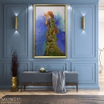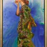 This is a captivating handmade painting that features a woman in a floral green dress. She is holding a pink rose to her face, appearing to be taking in its scent. The background is a blend of blue and green with splashes of color, adding depth and vibrancy to the piece. The painting is framed in an elegant gold frame, enhancing its aesthetic appeal. This artwork, with its beautiful subject and vibrant colors, would make a lovely addition to any art collection or living space. Enjoy this beautiful piece of art!