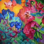 This exquisite handmade painting is a celebration of color and life, perfect for adding a touch of vibrancy to any space. It features a variety of flowers in full bloom, each rendered with distinct shapes and shades that capture the viewer’s attention. A large pink flower with intricate details is a focal point, its petals unfolding gracefully against the canvas. Blue flowers with elongated petals cluster together, providing a beautiful contrast with their deep color. Swirls of green foliage intersperse among the flowers, adding depth and dimension to the scene. The background is a harmonious blend of blues, greens, pinks, and yellows, transitioning seamlessly to create a cohesive and inviting composition. Bold and expressive brushstrokes give the painting an energetic yet elegant feel, making it an ideal choice for customers seeking a piece that combines natural beauty with artistic flair.