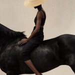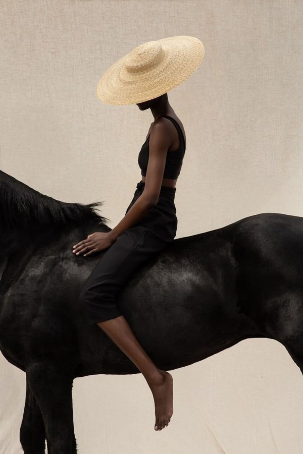 The painting portrays a woman figure seated on a black horse. The woman wears a wide-brimmed straw hat and a black sleeveless top, paired with black pants. The background features a neutral beige color, creating a striking contrast against the dark tones of the horse and the rider’s attire. The overall composition exudes elegance and simplicity, evoking a sense of calmness. It’s a captivating piece that could appeal to customers seeking unique and expressive art for their spaces.